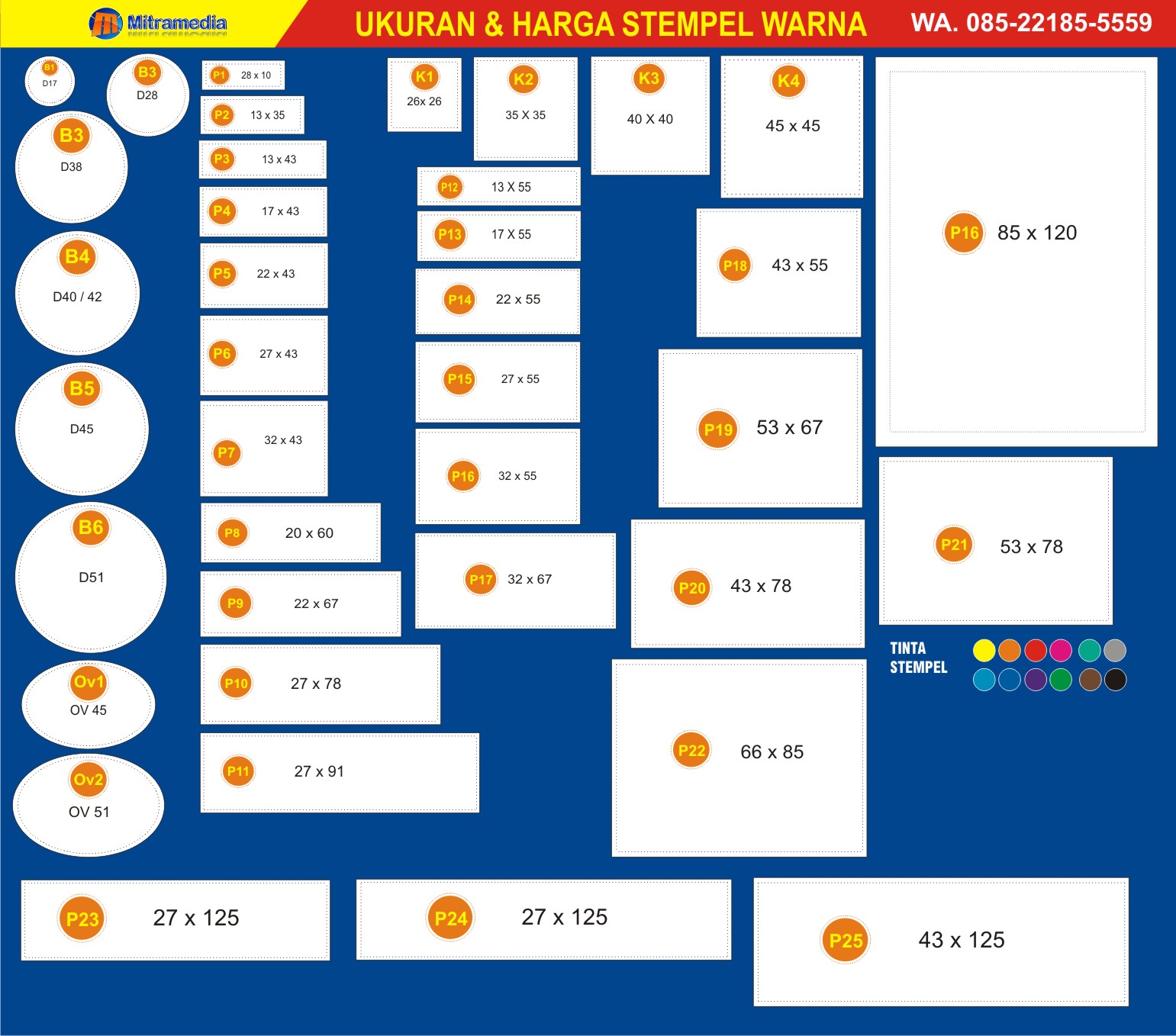 Untuk ukuran stempel kami menyediakan bermacam-macam ukuran dan bentuk stempel mulai dr kecil sampai besar, ada bentuk kotak, persegi panjang, oval & bulat.