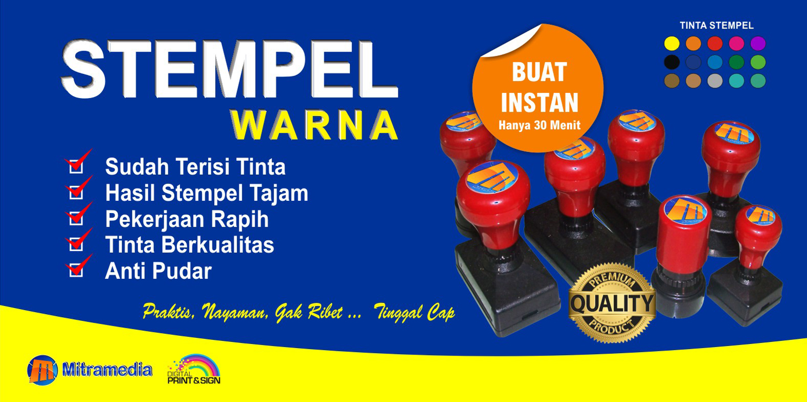 Mitramedia merupakan Jasa Pembuatan Stempel Flash untuk media kertas dan plastik, karet warna muda berlokasi di Tasikmalaya bertempat di Mall Mayasari Plaza, DIBUAT DENGAN MESIN CANGGIH BERKUALITAS TERBAIK, sehingga menghasilkan stempel lebih mendetail, merata, pekerjaan rapih, bersih tidak kotor di luar area gambar swaktu di stempel dan mudah di gunakan. Bisa membuat stempel sebanyak 4 warna dan selebihnya tidak di rekomendasikan, karena akan mempersempit penyimpanan tinta stempel, sehingga akan mudah cepat habis, alangkah baiknya maximal cukup 2 warna saja.